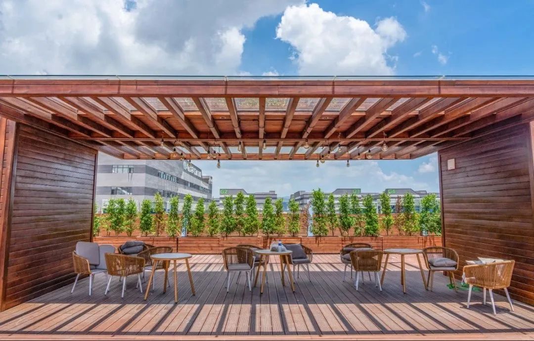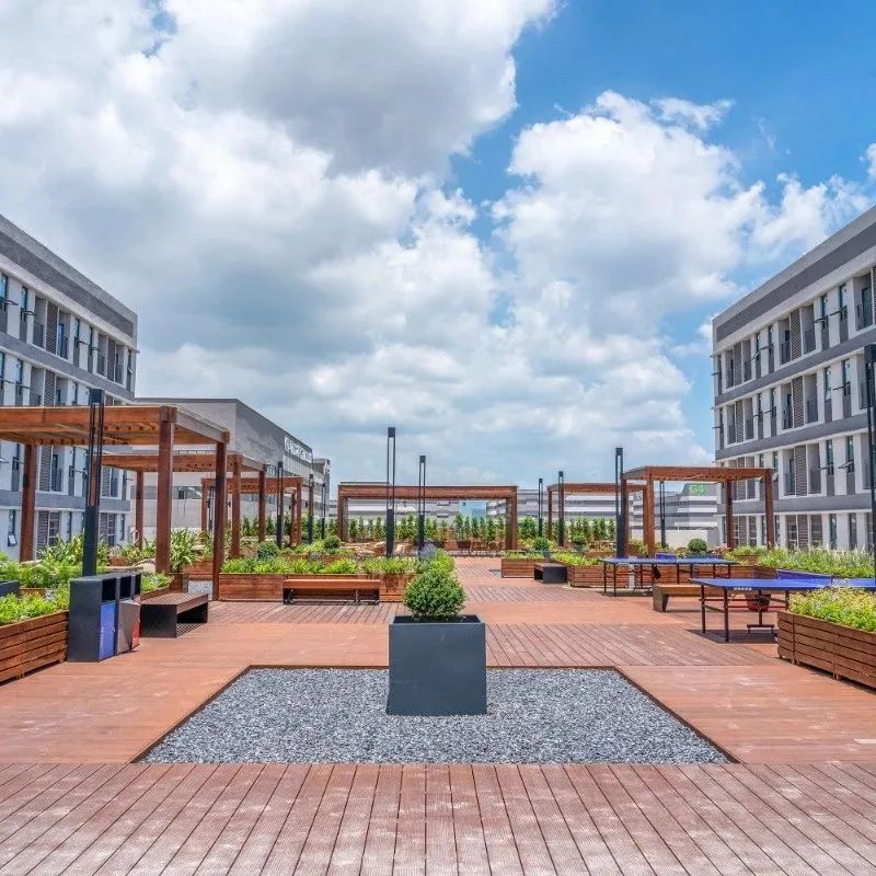 公共服務中心三層平臺設置了屋頂花園,形成半開放式創新社區??紤]到公共服務中心宿舍的分布,屋頂花園位于兩側宿舍動線中軸。
