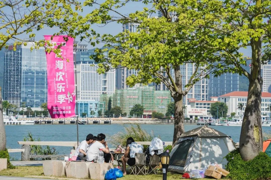 在花海長廊三號驛站,合作區首個預約露營區建成,利用橫琴二橋橋底及海堤側綠地,以特色綠化植物造景為主題,并設置觀演舞臺區、洗手池、插電樁、露營盒子、趣味打卡點、自然無動力兒童游樂區等露營配套設施,為游客打造依橋水畔趣味植物主題露營場地。