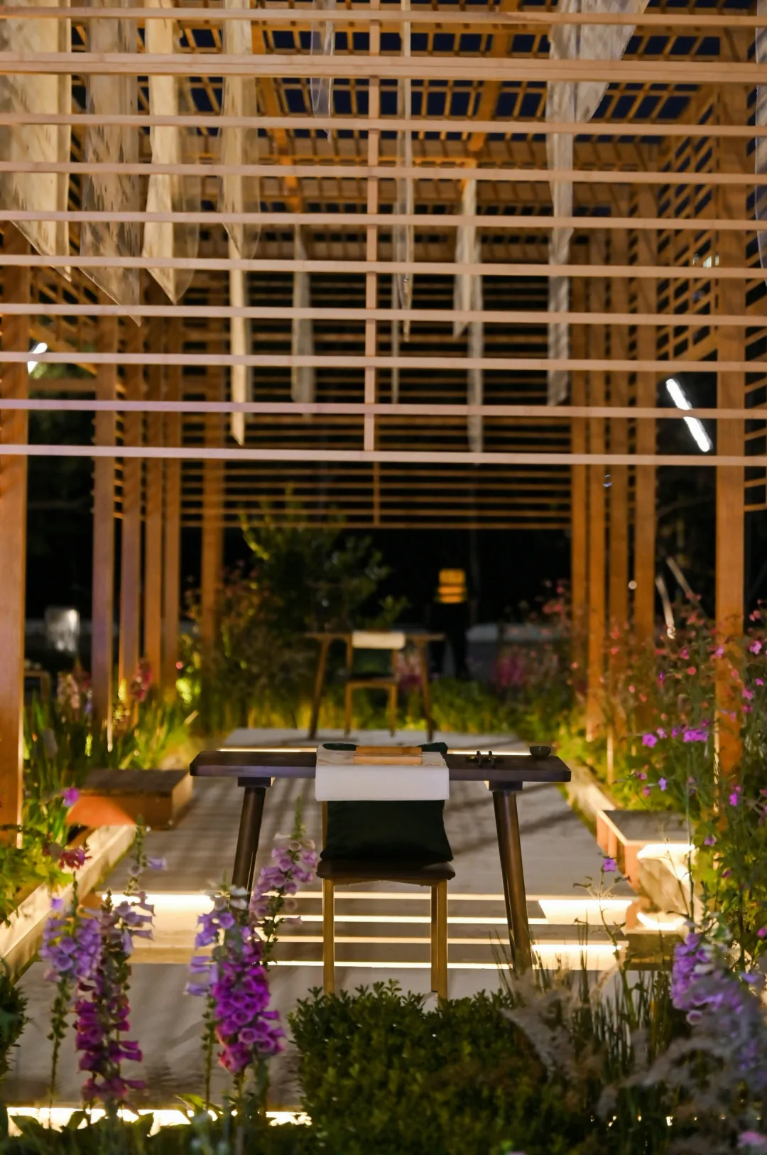 樹影婆娑,花香四溢,檸檬草、龍井茶、毛尖、柑橘、迷迭香等香草類植物,洋溢著沁人的花草清香,與茶文化主題交織呼應。