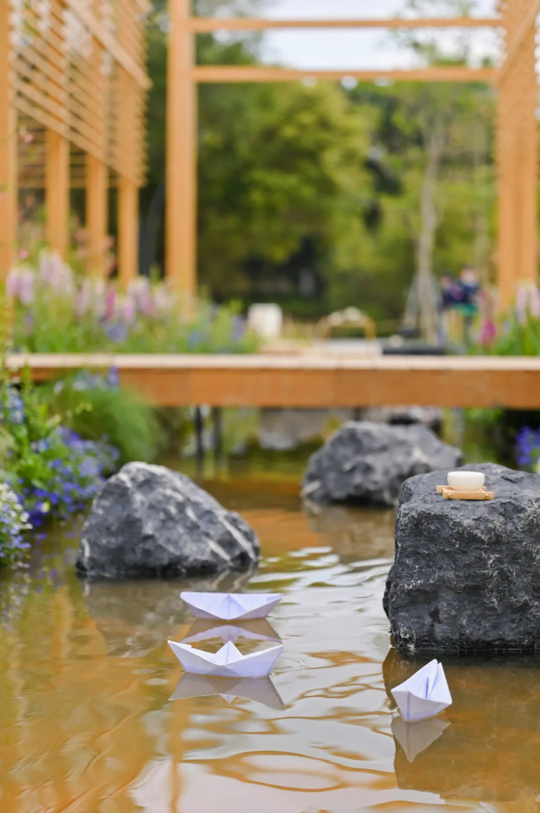 橫琴是一座生態島嶼,水元素代表了橫琴的歷史文化背景,循環互動裝置中的紙船象征著曾經的小漁船發展成為中國式現代化建設中揚帆起航的大船,在高速發展的同時,追本溯源,不忘初心。