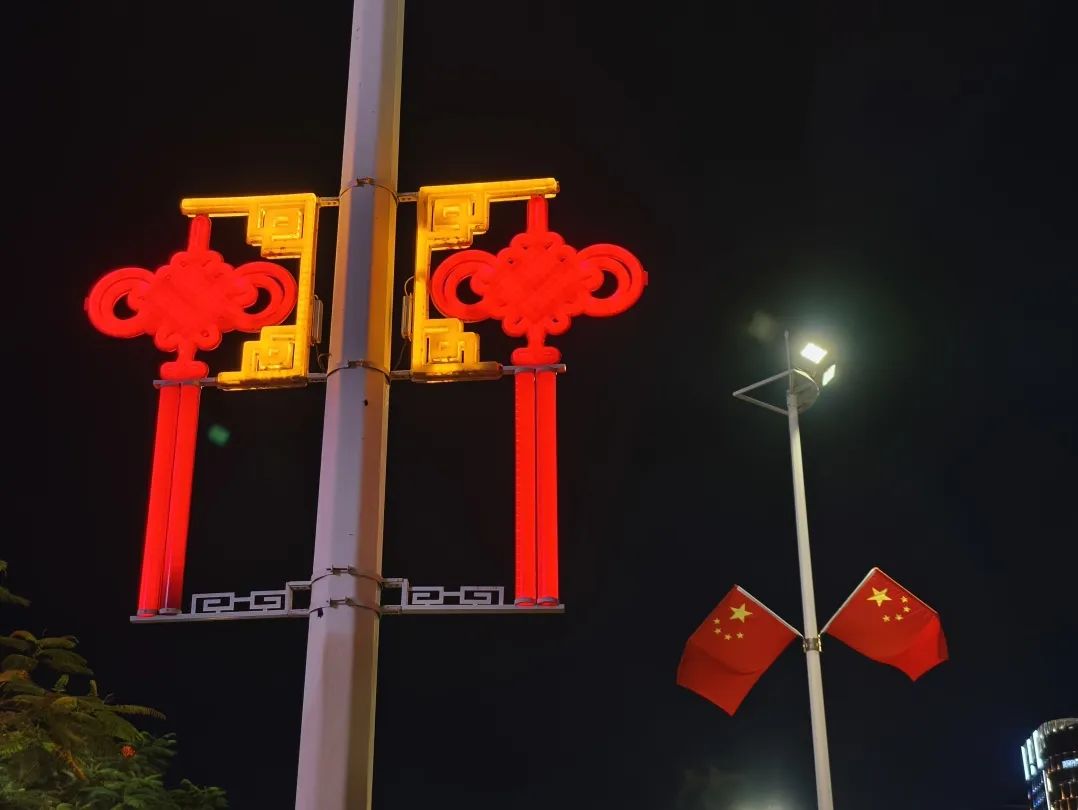 喜慶的中國結與迎風飄揚的五星紅旗交相輝映