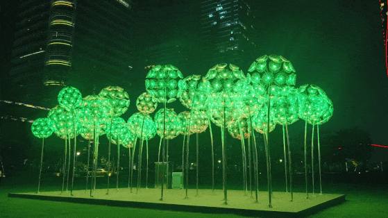 橫琴生態澤園的創意燈飾以含苞待放的喇叭花為主體造型,花朵使用充氣物料制成,內部藏有感應器。
