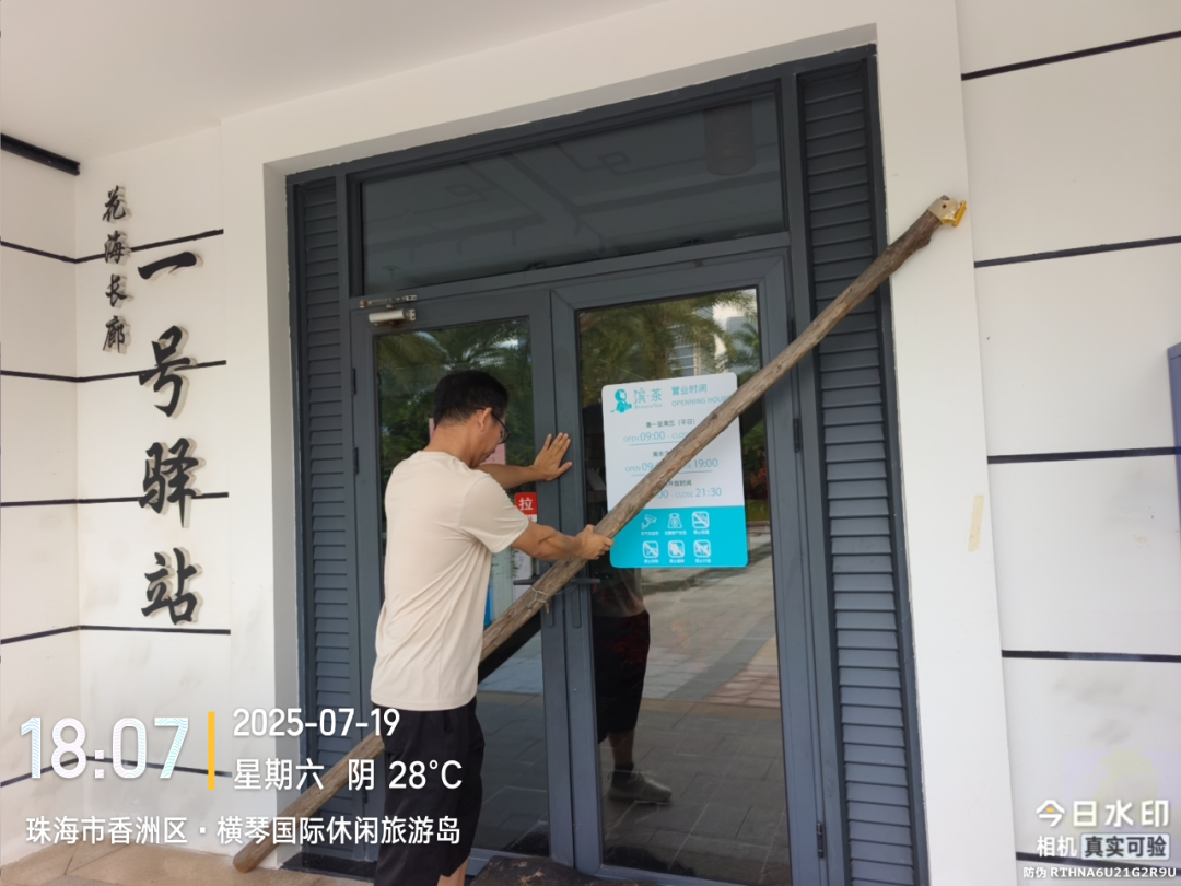 大橫琴口岸公司出動30余人次,對口岸及周邊排水管網、集水井、水泵房的疏導清掏,保障排水順暢;調動沙包2800余條,緊固件等物資,加固口岸340扇玻璃門。組織檢查水、電、暖通以及消防設備的運行狀態,共檢查了發電機組、板換設備、配電房和雨水提升泵等近20個設備設施進行檢查,保障了口岸的正常運作。通過電子屏、電視屏、溫馨提示、廣播等載體實時更新傳遞臺風預警信息、通關/閉關情況、外圍交通狀況,積極、耐心的與旅客解釋,方便旅客調整行程,保障旅客的安全。